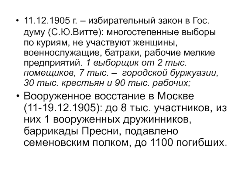 Слайд 1111.12.1905 г. – избирательный закон в Гос. думу (С.Ю.Витте): многостепенные