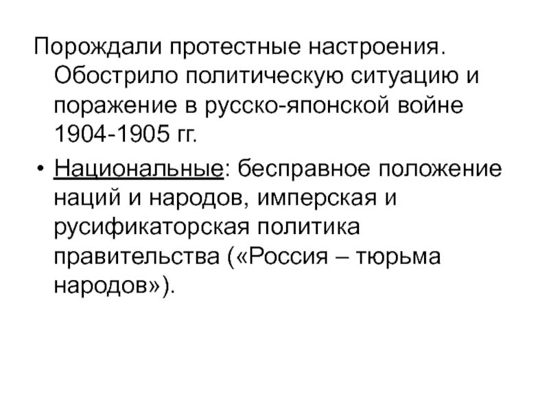 Слайд 4Порождали протестные настроения. Обострило политическую ситуацию и поражение в русско-японской