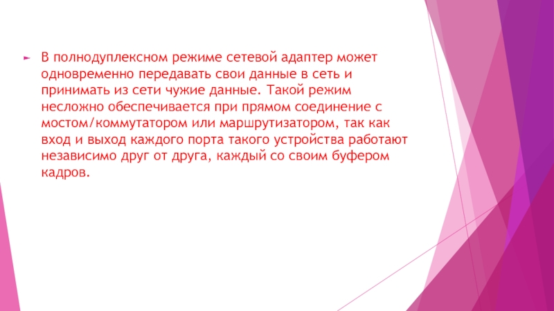Слайд 9В полнодуплексном режиме сетевой адаптер может одновременно передавать свои данные