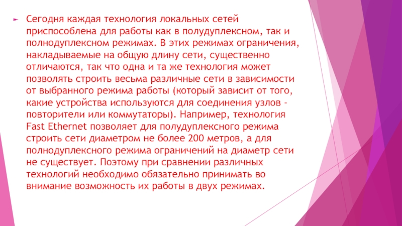 на общую длину сети, существенно отличаются, так что одна и та же технология может позволять строить весьма различные сети в зависимости от выбранного режима работы (который зависит от того, какие устройства используются для соединения узлов - повторители или коммутаторы). Например, технология Fast Ethernet позволяет для полудуплексного режима строить сети диаметром не более 200 метров, а для полнодуплексного режима ограничений на диаметр сети не существует. Поэтому при сравнении различных технологий необходимо обязательно принимать во внимание возможность их работы в двух режимах.