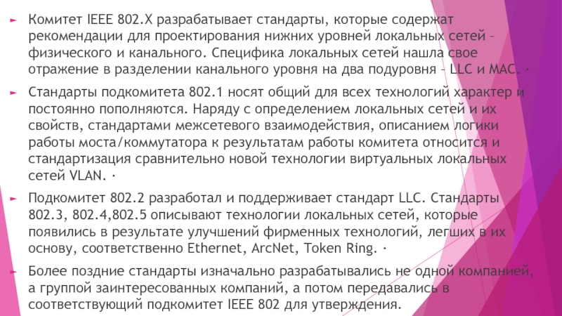 Подкомитет 802.2 разработал и поддерживает стандарт LLC. Стандарты 802.3, 802.4,802.5 описывают технологии локальных сетей, которые появились в результате улучшений фирменных технологий, легших в их основу, соответственно Ethernet, ArcNet, Token Ring. ·