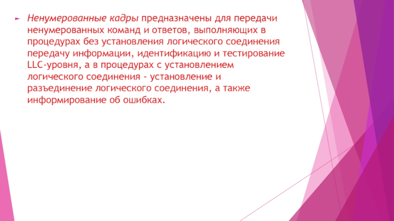 Слайд 23Ненумерованные кадры предназначены для передачи ненумерованных команд и ответов, выполняющих