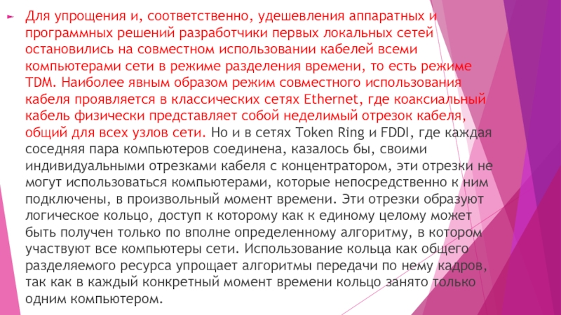 сети в режиме разделения времени, то есть режиме TDM. Наиболее явным образом режим совместного использования кабеля проявляется в классических сетях Ethernet, где коаксиальный кабель физически представляет собой неделимый отрезок кабеля, общий для всех узлов сети. Но и в сетях Token Ring и FDDI, где каждая соседняя пара компьютеров соединена, казалось бы, своими индивидуальными отрезками кабеля с концентратором, эти отрезки не могут использоваться компьютерами, которые непосредственно к ним подключены, в произвольный момент времени. Эти отрезки образуют логическое кольцо, доступ к которому как к единому целому может быть получен только по вполне определенному алгоритму, в котором участвуют все компьютеры сети. Использование кольца как общего разделяемого ресурса упрощает алгоритмы передачи по нему кадров, так как в каждый конкретный момент времени кольцо занято только одним компьютером.