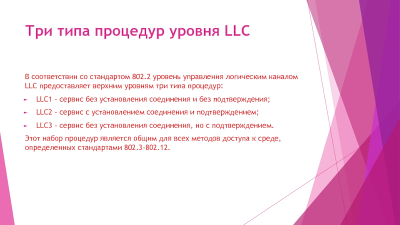 Слайд 19Три типа процедур уровня LLC