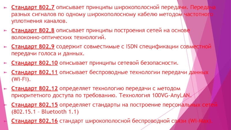 Слайд 17Стандарт 802.7 описывает принципы широкополосной передачи. Передача разных сигналов по