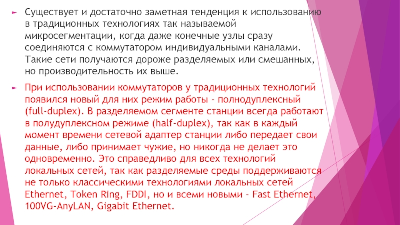 Современной тенденцией является частичный или полный отказ от разделяемых сред: соединение узлов индивидуальными связями (например, в технологии АТМ), широкое использование коммутируемых связей и микросегментации. Еще одна важная тенденция – появление полнодуплексного режима работы практически для всех технологий локальных сетей. ·