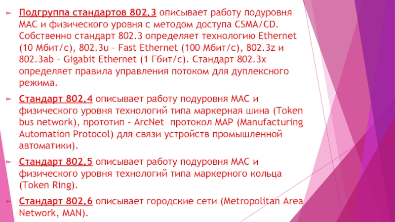 Слайд 16Подгруппа стандартов 802.3 описывает работу подуровня MAC и физического уровня