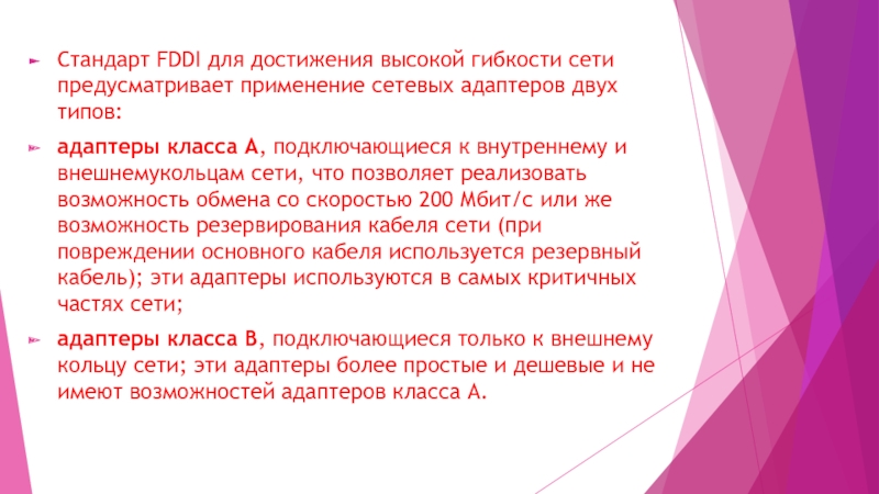 Слайд 8Стандарт FDDI для достижения высокой гибкости сети предусматривает применение сетевых