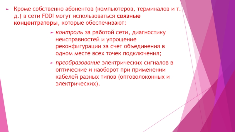 Слайд 9Кроме собственно абонентов (компьютеров, терминалов и т.д.) в сети FDDI