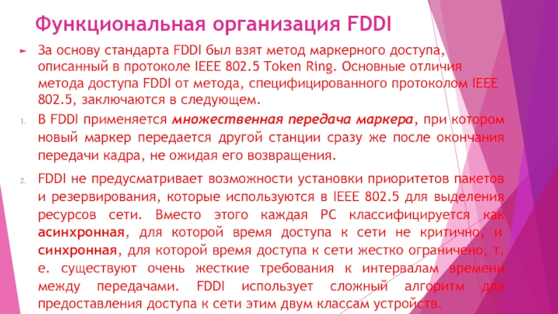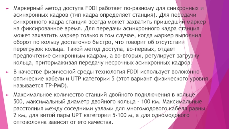 Слайд 20Маркерный метод доступа FDDI работает по-разному для синхронных и асинхронных