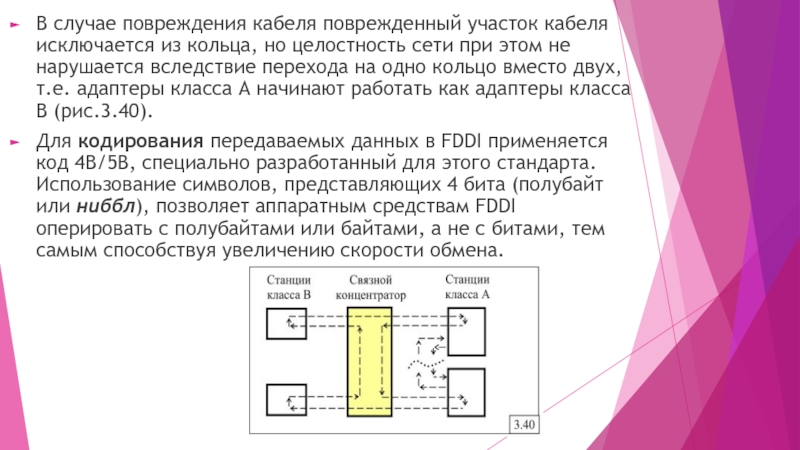 Слайд 11В случае повреждения кабеля поврежденный участок кабеля исключается из кольца,