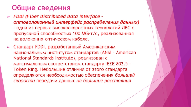 Стандарт FDDI, разработанный Американским национальным институтом стандартов (ANSI – American National Standards Institute), реализован с максимальным соответствием стандарту IEEE 802.5 – Token Ring. Небольшие отличия от этого стандарта определяются необходимостью обеспечения большей скорости передачи данных на большие расстояния.