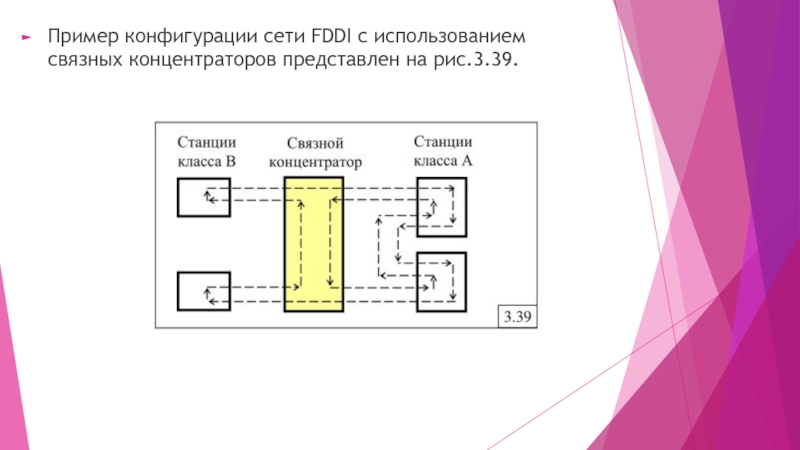 Слайд 10Пример конфигурации сети FDDI с использованием связных концентраторов представлен на