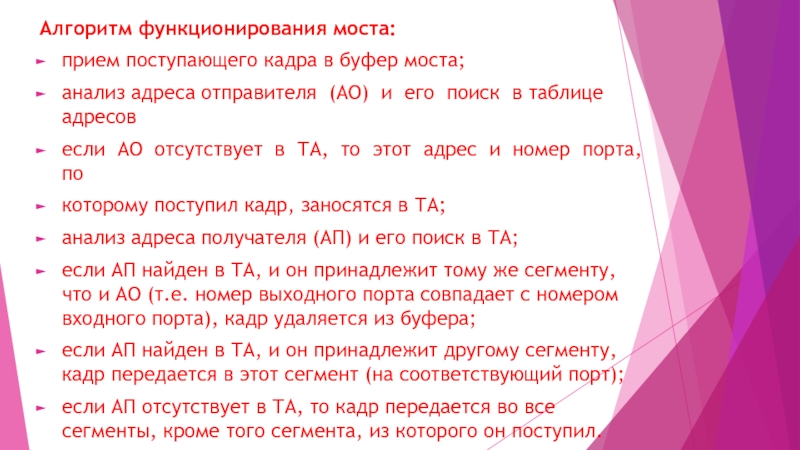 если АП отсутствует в ТА, то кадр передается во все сегменты, кроме того сегмента, из которого он поступил.