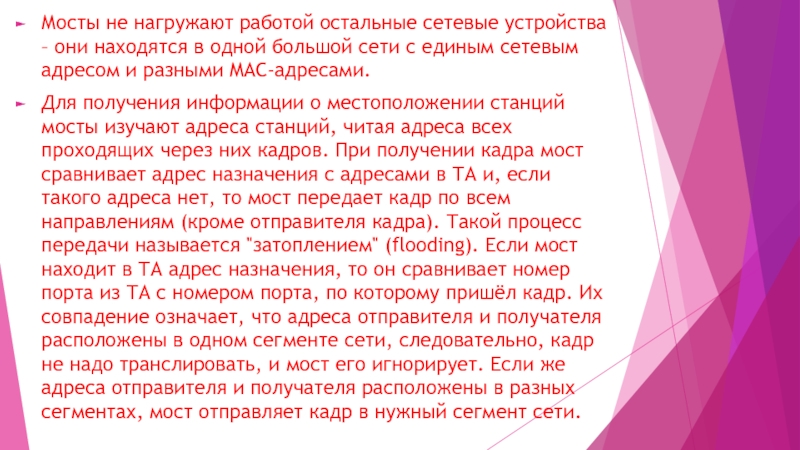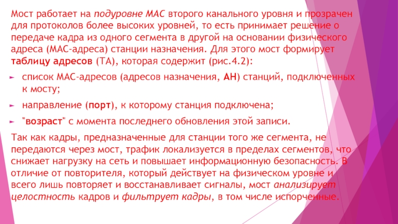 Слайд 3Мост работает на подуровне МАС второго канального уровня и прозрачен