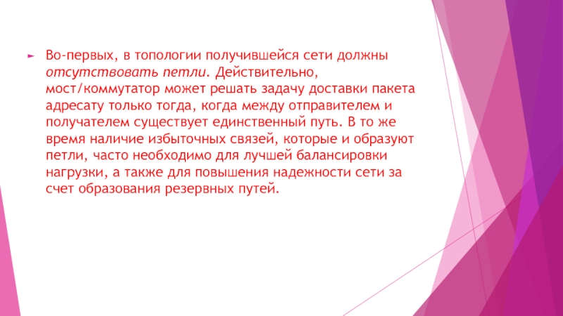 Слайд 19Во-первых, в топологии получившейся сети должны отсутствовать петли. Действительно, мост/коммутатор
