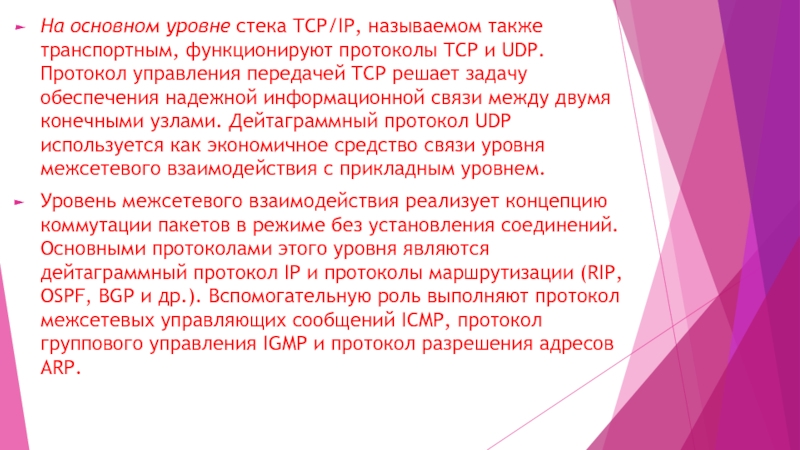 Слайд 37На основном уровне стека TCP/IP, называемом также транспортным, функционируют протоколы