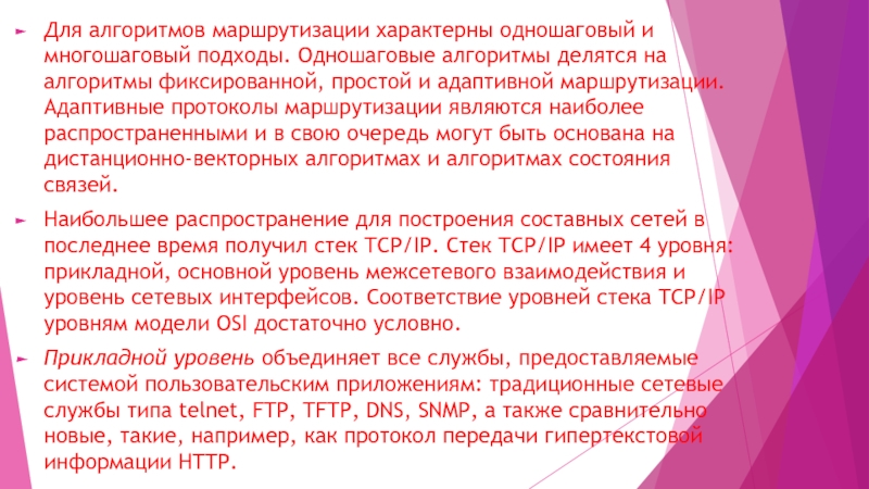 делятся на алгоритмы фиксированной, простой и адаптивной маршрутизации. Адаптивные протоколы