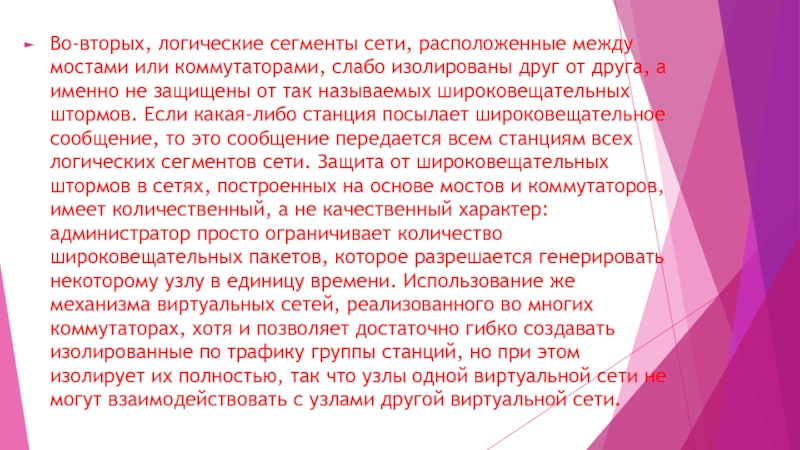 Слайд 20Во-вторых, логические сегменты сети, расположенные между мостами или коммутаторами, слабо