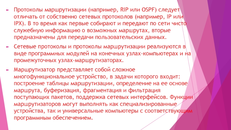 Слайд 35Протоколы маршрутизации (например, RIP или OSPF) следует отличать от собственно