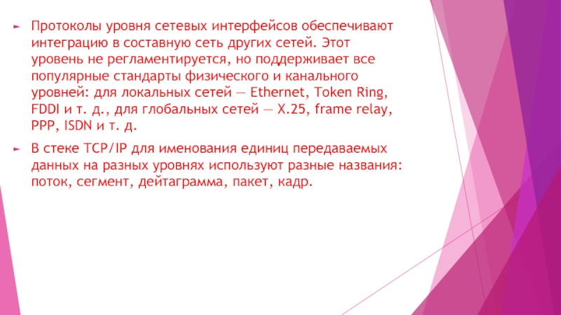 Слайд 38Протоколы уровня сетевых интерфейсов обеспечивают интеграцию в составную сеть других