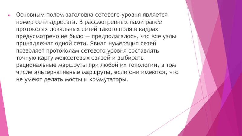 Слайд 32Основным полем заголовка сетевого уровня является номер сети-адресата. В рассмотренных