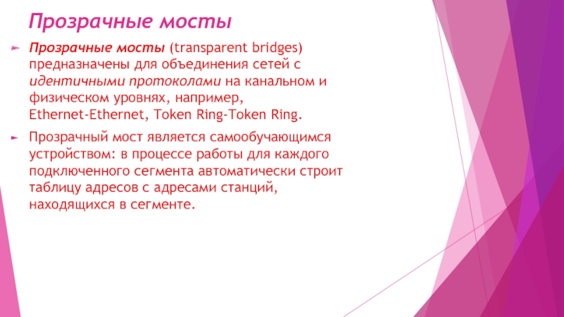 Прозрачные мосты (transparent bridges) предназначены для объединения сетей с