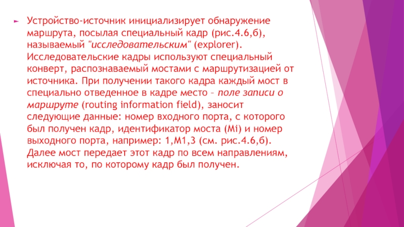 Слайд 15Устройство-источник инициализирует обнаружение маршрута, посылая специальный кадр (рис.4.6,б), называемый "исследовательским"