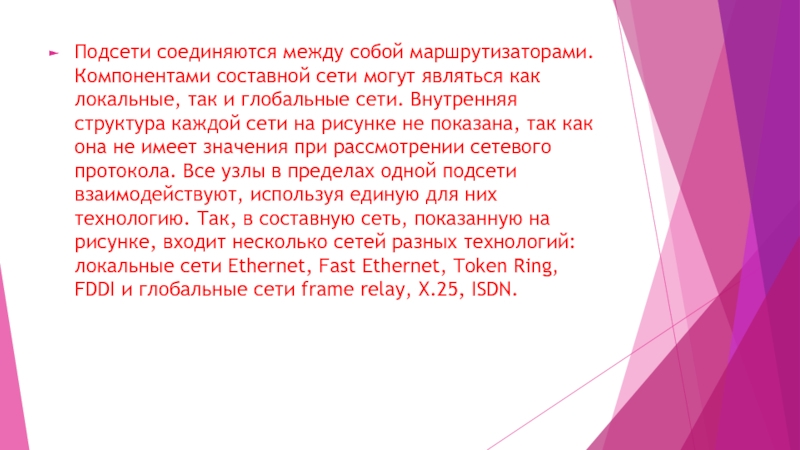 Слайд 25Подсети соединяются между собой маршрутизаторами. Компонентами составной сети могут являться