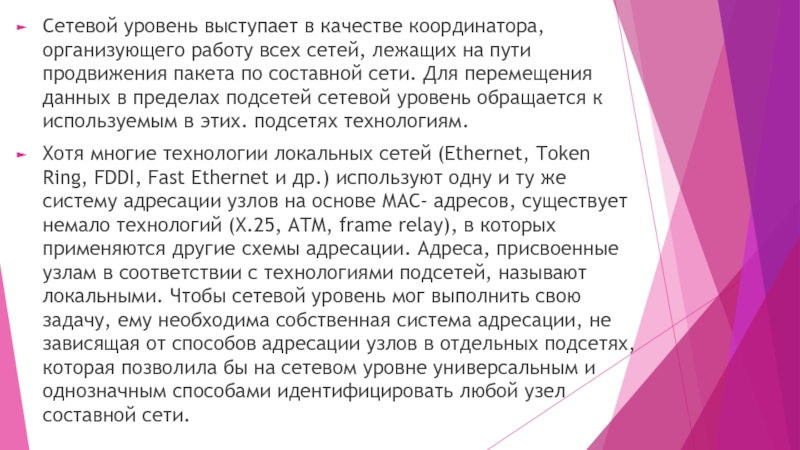 Слайд 27Сетевой уровень выступает в качестве координатора, организующего работу всех сетей,
