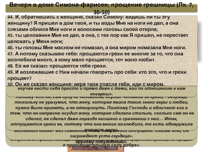 Блж. Феофилакт: «Господь обнаруживает в Симоне гордеца и безумца: гордеца, потому что он, сам будучи человеком, осудил человека за грехи; - безумца, поскольку не уразумел, что жену, которая явила такие знаки веры и любви, нужно было принять, а не отвергнуть. Поэтому Господь и обличает его в том, что он напрасно осудил жену, которая сделала столько, сколько сам он не сделал, не сделал даже гораздо низшего в сравнении с ней… Итак, отпущаются грехи ее, потому что она много возлюбила, то есть обнаружила великую веру».