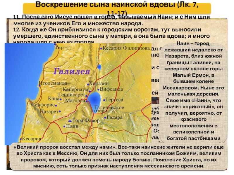 «Великий пророк восстал между нами». Все-таки наинские жители не верили еще во Христа как в Мессию, Он для них был только посланником Божиим, великим пророком, который должен помочь народу Божию. Появление Христа, по их мнению, есть только признак наступления мессианского времени.