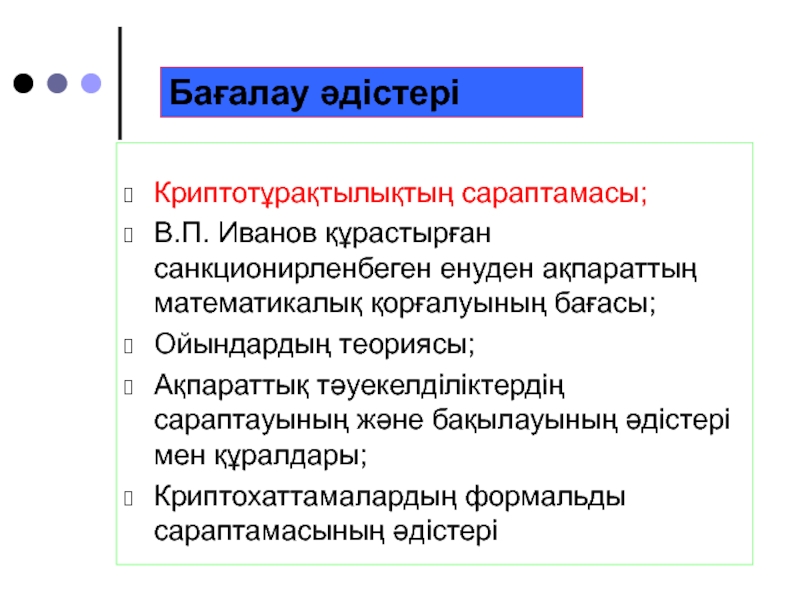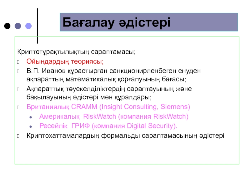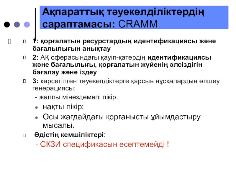 Ақпараттық тәуекелділіктердің сараптауының және бақылауының әдістері мен құралдары;