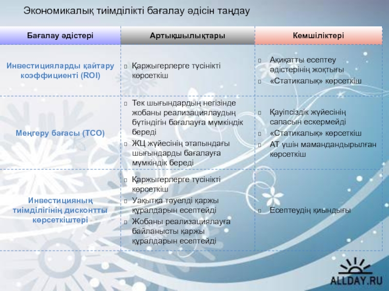 Слайд 40Экономикалық тиімділікті бағалау әдісін таңдау