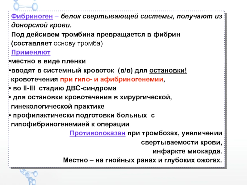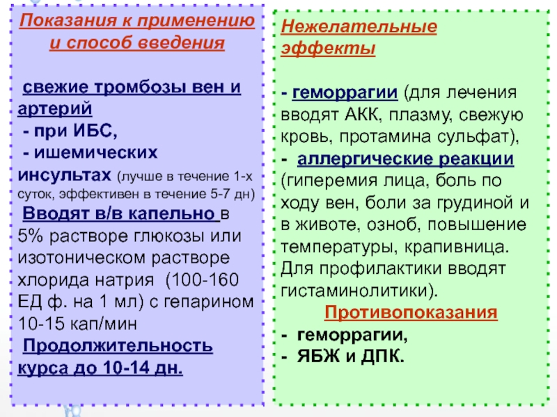 Применяют местно для профилактики тромбозов Рекомбинантный гирудин –лепирудин получают из культуры дрожжевых клеток, применяют как дополнительное средство тромболитической терапии острого инфаркта миокарда, травматологии