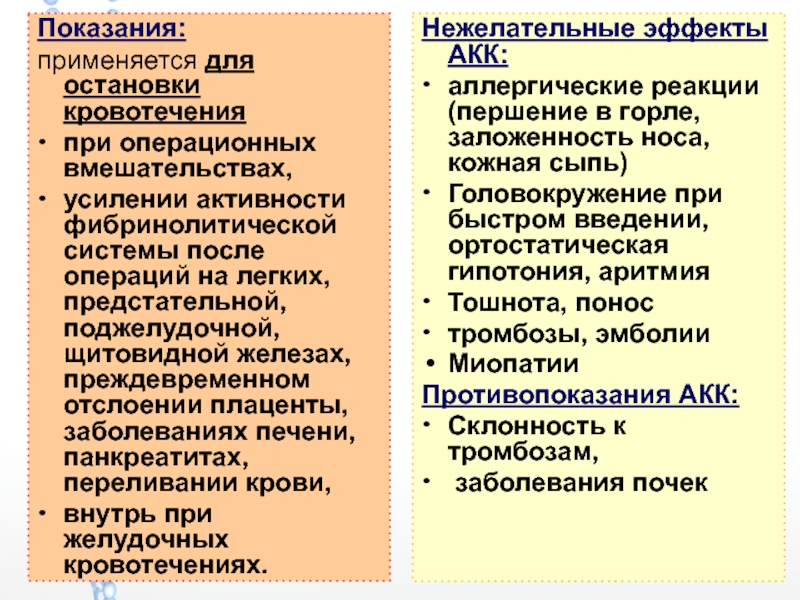 способствует сохранению фибринных тромбов, экономии белков ССК и остановке кровотечения, особенно при повышении активности системы фибринолиза, в условиях дефицита ССК.