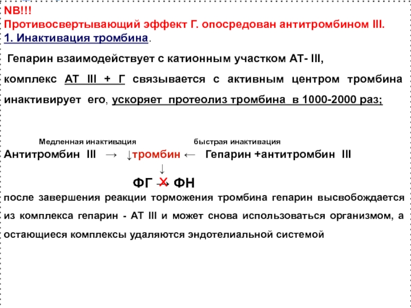 III + Г связывается с активным центром тромбина инактивирует его, ускоряет протеолиз тромбина в 1000-2000 раз;
