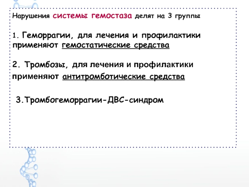 Слайд 6Нарушения системы гемостаза делят на 3 группы