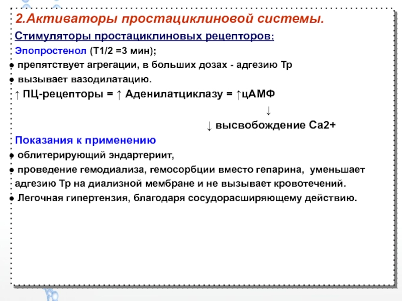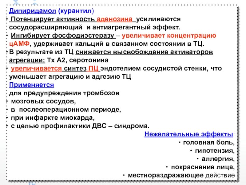 4.сорбируется на мембранах эндотелия сосудов и форменных элементов крови и препятствует агрегации и адгезии эритроцитов, тромбоцитов и высвобождению из них агрегирующих факторов;