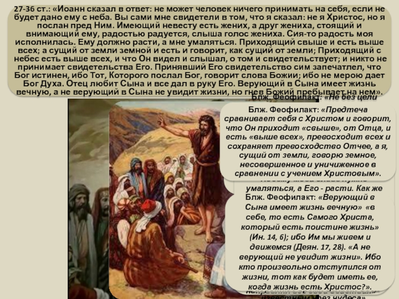Блж. Феофилакт: «Предтеча сравнивает себя с Христом и говорит, что Он приходит «свыше», от Отца, и есть «выше всех», превосходит всех и сохраняет превосходство Отчее, а я, сущий от земли, говорю земное, несовершенное и уничиженное в сравнении с учением Христовым».