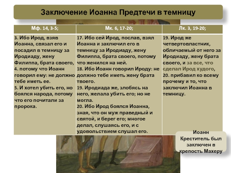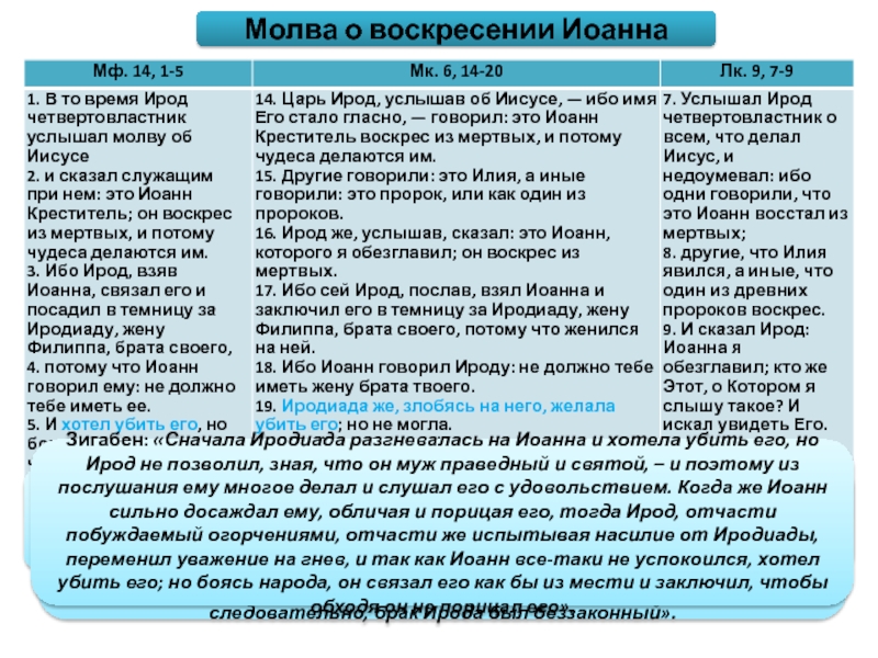 Зигабен: «Сначала Иродиада разгневалась на Иоанна и хотела убить его, но Ирод не позволил, зная, что он муж праведный и святой, – и поэтому из послушания ему многое делал и слушал его с удовольствием. Когда же Иоанн сильно досаждал ему, обличая и порицая его, тогда Ирод, отчасти побуждаемый огорчениями, отчасти же испытывая насилие от Иродиады, переменил уважение на гнев, и так как Иоанн все-таки не успокоился, хотел убить его; но боясь народа, он связал его как бы из мести и заключил, чтобы обходя он не порицал его».