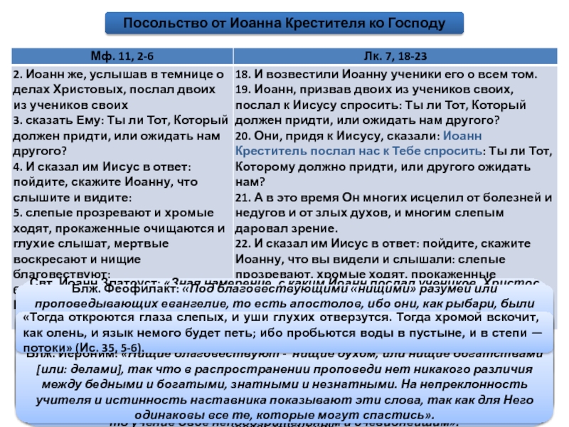 Свт. Иоанн Златоуст: «Зная намерение, с каким Иоанн послал учеников, Христос в тот же час исцелил слепых, хромых и других многих – не с тем, чтобы, уверить Иоанна (на что было уверять уверенного?), но чтобы уверить сомневающихся учеников. И потом присовокупил: «И блажен, кто не соблазнится о Мне», показав тем, что знает и тайные помышления их. Если бы Он сказал: точно, Я Христос, – то, как заметил я, это могло быть для них неприятно и могло навести на мысль, хотя бы они и не высказали ее, подобно иудеям: Ты Сам о Себе свидетельствуешь (Ин.8:13). Вот потому сам Он и не говорит этого, а предоставляет им заключать обо всем из чудес, делая через то учение Свое неподозрительным и очевиднейшим».