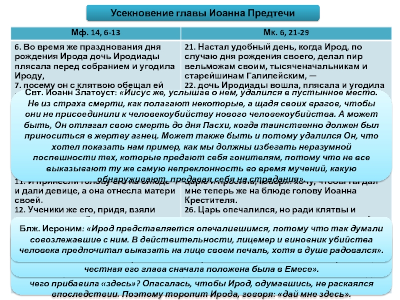 Блж. Феофилакт: «Опечалился по причине добродетели, ибо и враг удивляется добродетели. Однако в силу своей клятвы дает бесчеловечный дар. Узнаем же отсюда, что лучше преступить клятву, чем по причине клятвы сделать что-либо нечестивое. Тело Крестителя погребено было в Севастии Кесарийской, а честная его глава сначала положена была в Емесе».