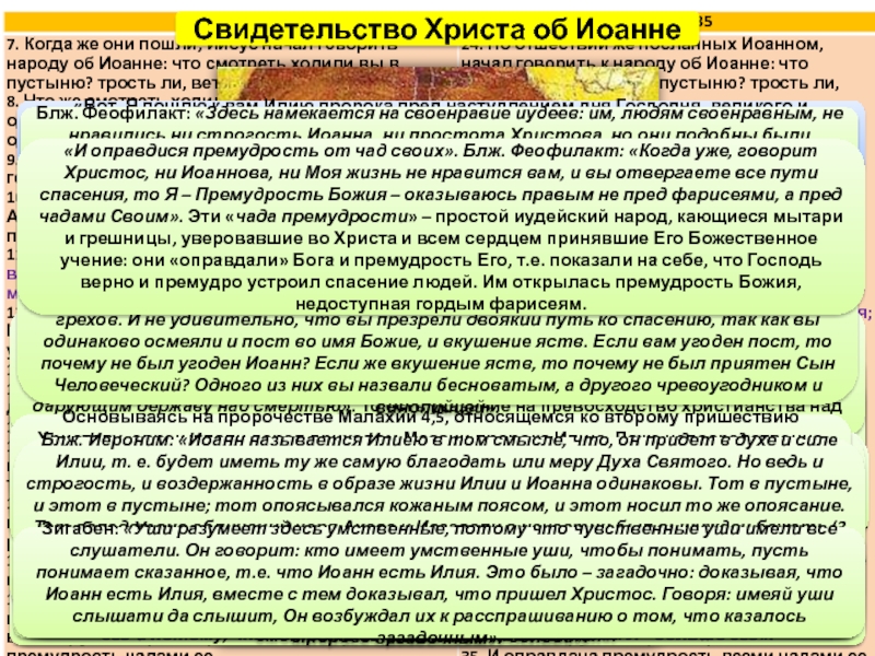 Блж. Феофилакт: «Я - меньший по сравнению с Иоанном и по возрасту, и, по вашему мнению, больше его в отношении к духовным и небесным благам, ибо здесь Я меньше его и потому, что он почитается у вас великим, но там Я - больше его».