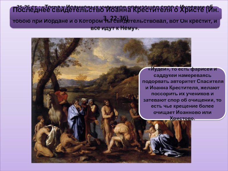 «Иудеи», то есть фарисеи и саддукеи намереваясь подорвать авторитет Спасителя и Иоанна Крестителя, желают поссорить их учеников и затевают спор об очищении, то есть чье крещение более очищает Иоанново или Христово.