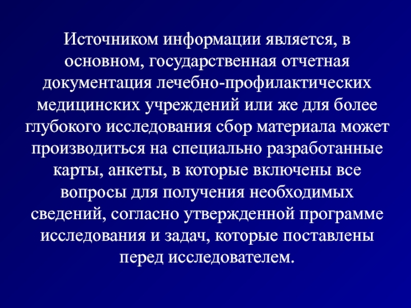 Источником информации является, в основном, государственная отчетная документация лечебно-профилактических медицинских
