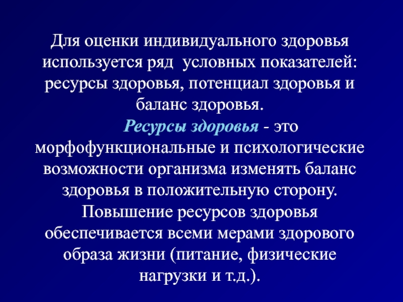 Слайд 7Для оценки индивидуального здоровья используется ряд условных показателей: ресурсы здоровья,