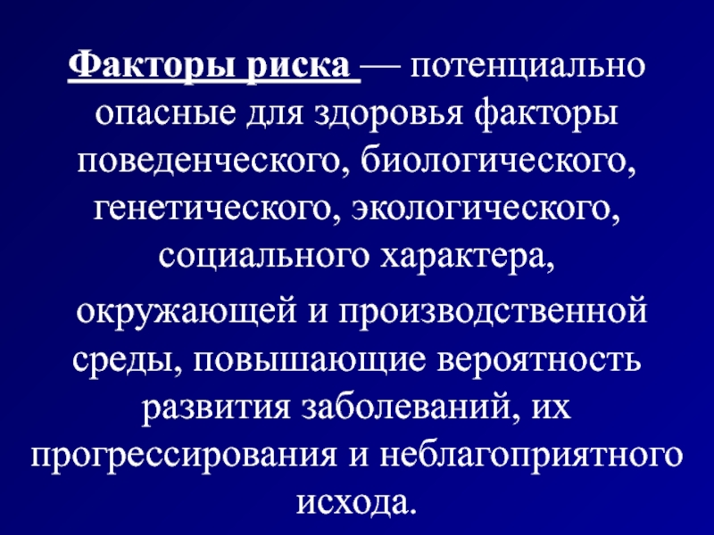 Слайд 15Факторы риска — потенциально опасные для здоровья факторы поведенческого, биологического,