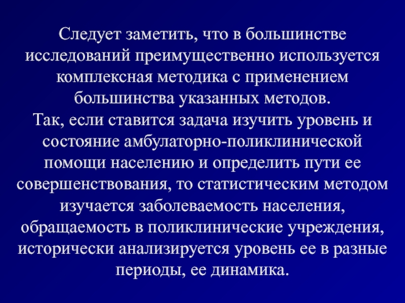 уровень и состояние амбулаторно-поликлинической помощи населению и определить пути ее совершенствования, то статистическим методом изучается заболеваемость населения, обращаемость в поликлинические учреждения, исторически анализируется уровень ее в разные периоды, ее динамика.