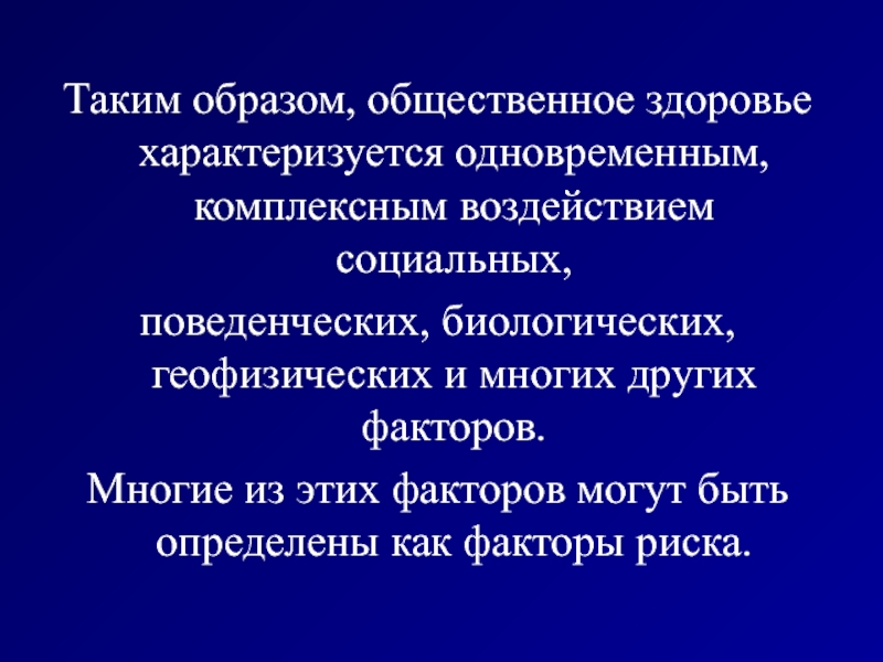 Слайд 14Таким образом, общественное здоровье характеризуется одновременным, комплексным воздействием социальных,